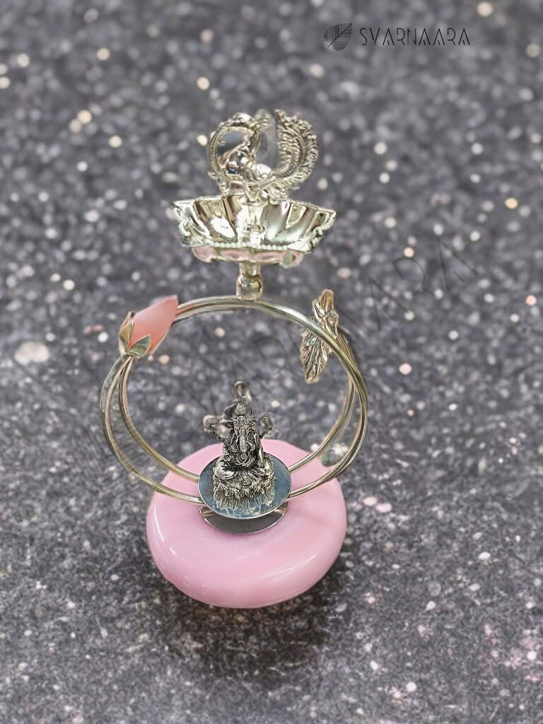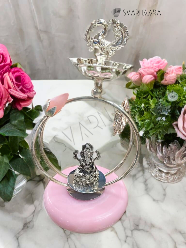Lord Ganesa Jyot is a meticulously crafted spiritual lamp featuring a peacock design and a base made of rose quartz. This combination not only enhances the aesthetic appeal but also imbues the lamp with symbolic significance—peacock representing beauty and protection, and rose quartz known for its calming and healing properties. Ideal for sacred spaces, this Jyot brings both elegance and positive energy to your devotional rituals.